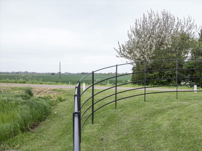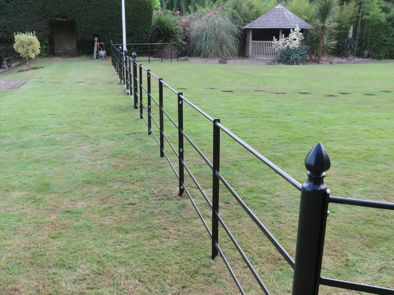 The posts can be installed with the lie of the land, creating a beautiful flowing fence line. The rails come in 5m lengths as standard and are threaded through the posts, using a steel clip to secure, this is modern day take on how the blacksmiths would have installed it historically.